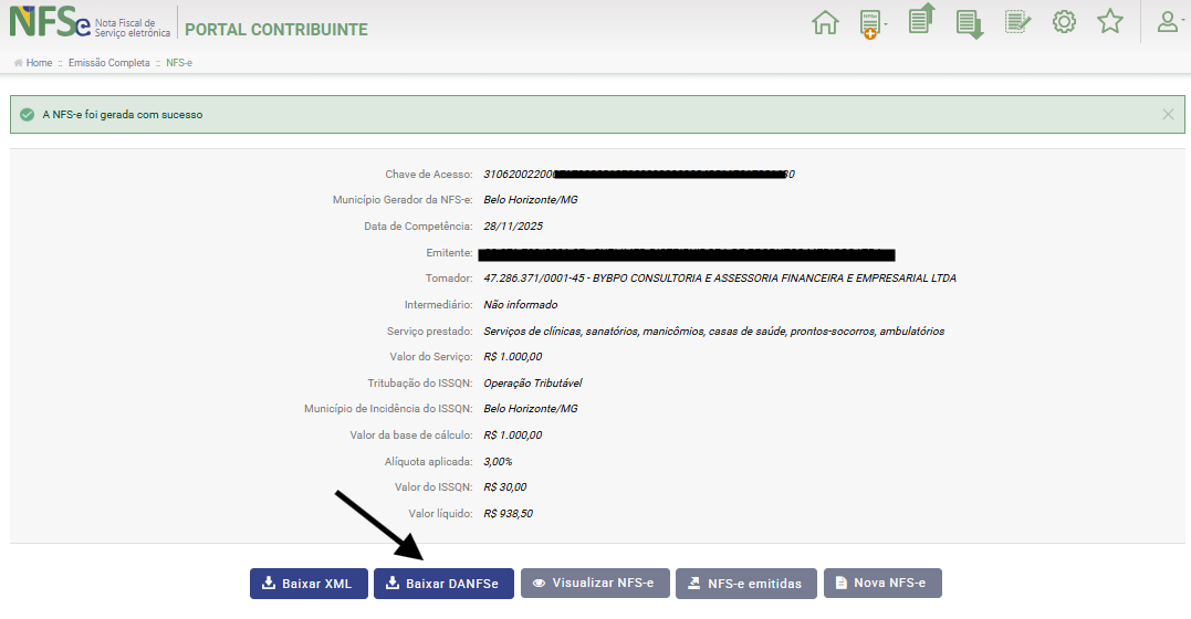 Exibirá um resumo da nota e abaixo o local para baixar PDF DANFESe